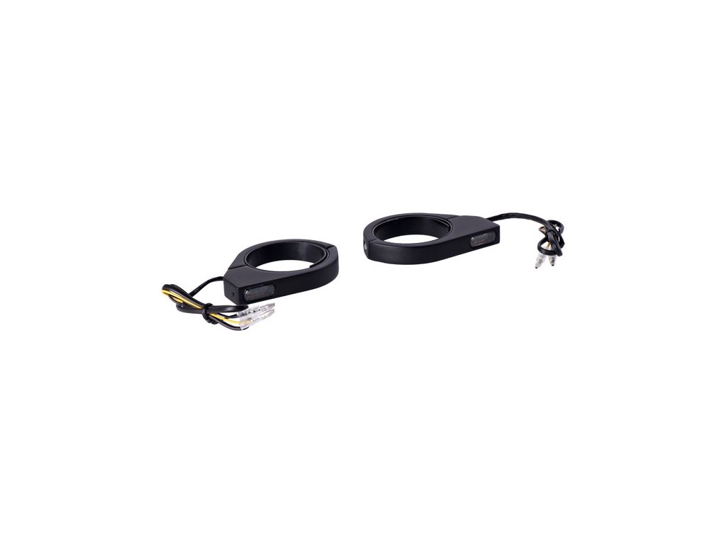 - Matte black - Material: zinc - Diameter: 42mm to 52mm - Lens: ECE approved amber colored One of the most inconspicuous ways to install front LED turn signals. The included filler-strip makes these matte black zinc turn signals clamps compatible with 42mm to 52mm fork tube diameters. Complete with wiring and an amber ECE approved lens. Fits: > Universal