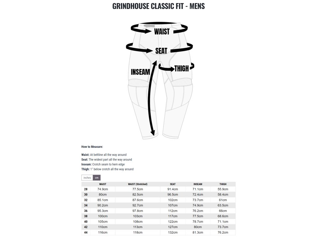 Kalhoty Fasthouse Grindhouse Pant jsou určené pro jízdu na motokrosových, endurových motocyklech či quadech. Velikost zvolte podle obvodu sníženého pasu jezdce. Pokud jezdec používá chrániče (například bederní pás), které zasahují do prostoru pasu a nejsou umístěny nad kalhotami či na kalhotách zvenku, ale přímo mezi tělem a kalhotami, měřte obvod sníženého pasu (obvodu kolem vrcholu kyčelních kostí) s nasazenými chrániči. Série Grindhouse používá kvalitní materiály a tradiční střih, oblečení je konstruováno tak, aby vydrželo mnohé tréninky i obstálo jako závodní funkční oblečení. Klíčové vlastnosti zahrnují: hlavní konstrukce kalhot je tvořena z vysokogramážní 600D látky, spodní konstrukce kalhot je tvořena stretch materiálem s pružností do 4 stran, pevné nylonové nitě spojují jednotlivé panely látek dvojitými či trojitými švy, obsahuje brandová označení aplikované TPR technologií, kolenní panely jsou pružné do dvou stran, pánevní panel je také pružný do dvou stran, vnitřní kolenní panely jsou z pravé nepískované kůže, takže vydrží vyšší či vícečetnou zátěž včetně tepelné, zip je schován a překryt látkou, obvod pasu lze upravit nastavitelným plastovým páskem a postranními suchými zipy, pánevní panel je tvořen vícerými plochami látek pro vyšší či vícečetnou zátěž. Přední panel kalhot je v nejvyšším místě děrovaný pro extra ventilaci, vnitřní lehké síťovaná podšívka je umístěna v kalhotách do 3/4 jejich délky, čímž optimalizuje možný pohyb jezdce v ortézách, které nemají tak velkou šanci zadrhnout se o vnitřní švy kalhot, pokud by byly nepřekryté.